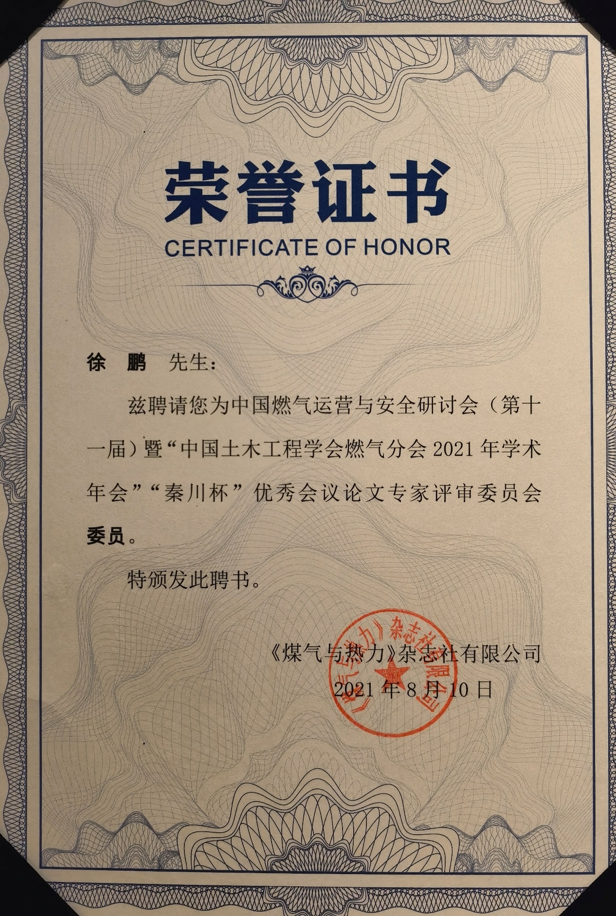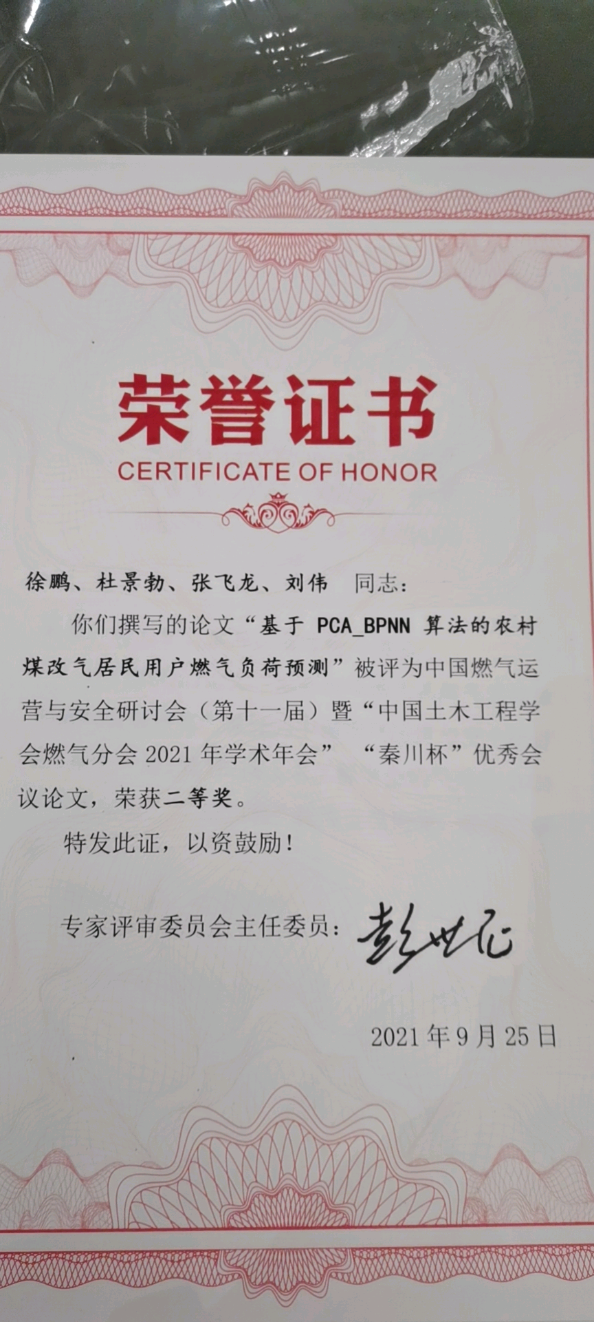 同期举办的燃气学会年会上,徐鹏老师被聘为论文评审委员会委员和颁奖嘉宾,所投稿论文《基于PCA_BPNN算法的城镇煤改气用户燃气负荷预测》经盲评,获评二等奖。