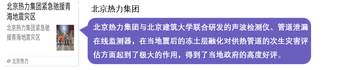 在本次驰援中,与北京市热力集团联合研发声波检测仪和管道泄漏在线监测器发挥了重要作用,同时,基于人工大数据的供热管网运行状况与安全智能诊断报警关键技术,在紧急驰援青海地震灾区及震后的冻土层融化对供热管道的次生灾害评估方面起到了极大的作用,得到了当地政府、青海省住建厅和住建部的肯定和好评,并在青海门源县电视台、中国建设报和北京热力集团网站等媒体陆续进行了报道。